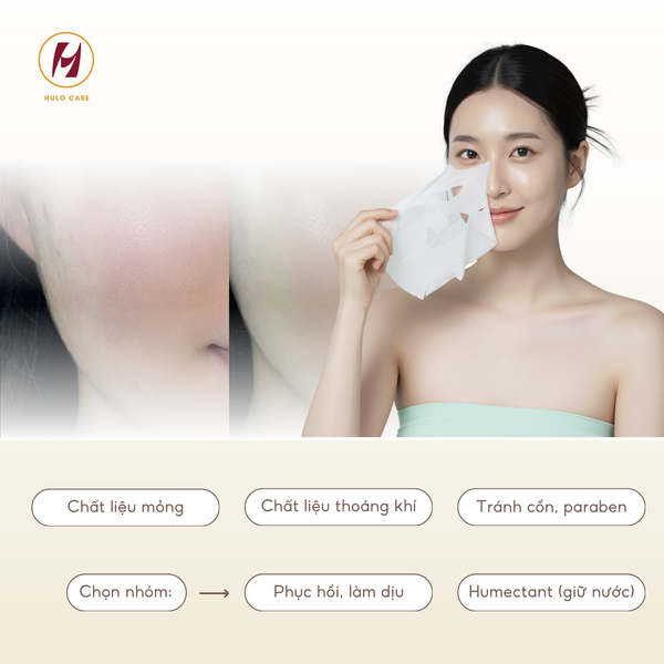 Hãy tìm kiếm các loại giàu Hyaluronic Acid, Glycerin (chất cấp ẩm) và các chiết xuất Lô Hội để mang lại cảm giác dễ chịu. Đặc biệt, bạn luôn cần kiểm tra thành phần để đảm bảo không có hương liệu (Fragrance) hoặc cồn khô, và chọn chất liệu mặt nạ mỏng nhẹ như Bio-cellulose.