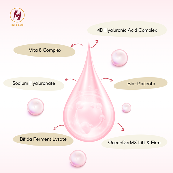Mục tiêu trọng tâm của Hulo Youthful Glow Sheet Mask là hỗ trợ cấp ẩm đa tầng và dưỡng sáng, từ đó giúp bề mặt trông căng mịn và rạng rỡ. Các thành phần chính dưới đây phối hợp để mang lại hiệu ứng “đầy - mịn - sáng” cho da: