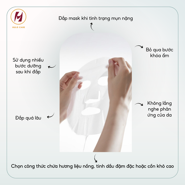 Tuy nhiên, rủi ro thường xảy ra khi bạn chọn sai mặt nạ hoặc đắp quá lâu. Những loại mặt nạ có kết cấu quá dày, chứa nhiều hương liệu hay cồn khô dễ kích ứng có thể ảnh hưởng đến hàng rào bảo vệ da, gây đỏ rát hoặc gây bít tắc lỗ chân lông. Ngoài ra, việc đắp quá thời gian quy định sẽ khiến miếng mặt nạ khô dần, hút ngược độ ẩm ra ngoài, làm da mất cân bằng và tiết nhiều dầu hơn, vô tình khiến tình trạng mụn trở nên khó kiểm soát.