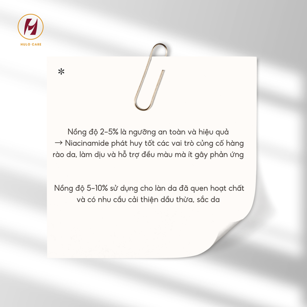 Trong mỹ phẩm, nồng độ Niacinamide từ 2-5% được xem là ngưỡng an toàn và hiệu quả cho đa số làn da. Ở mức này, Niacinamide phát huy tốt các vai trò củng cố hàng rào da, làm dịu và hỗ trợ đều màu mà ít gây phản ứng không mong muốn.