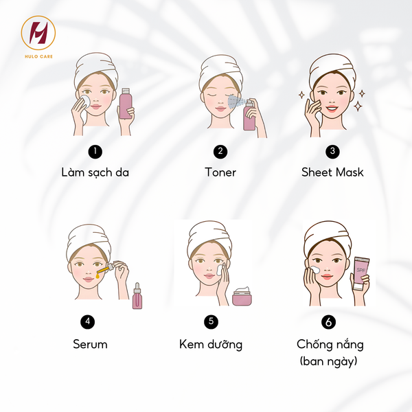 Thứ tự gợi ý: Làm sạch - Sheet mask - Toner - Serum - Kem dưỡng.
